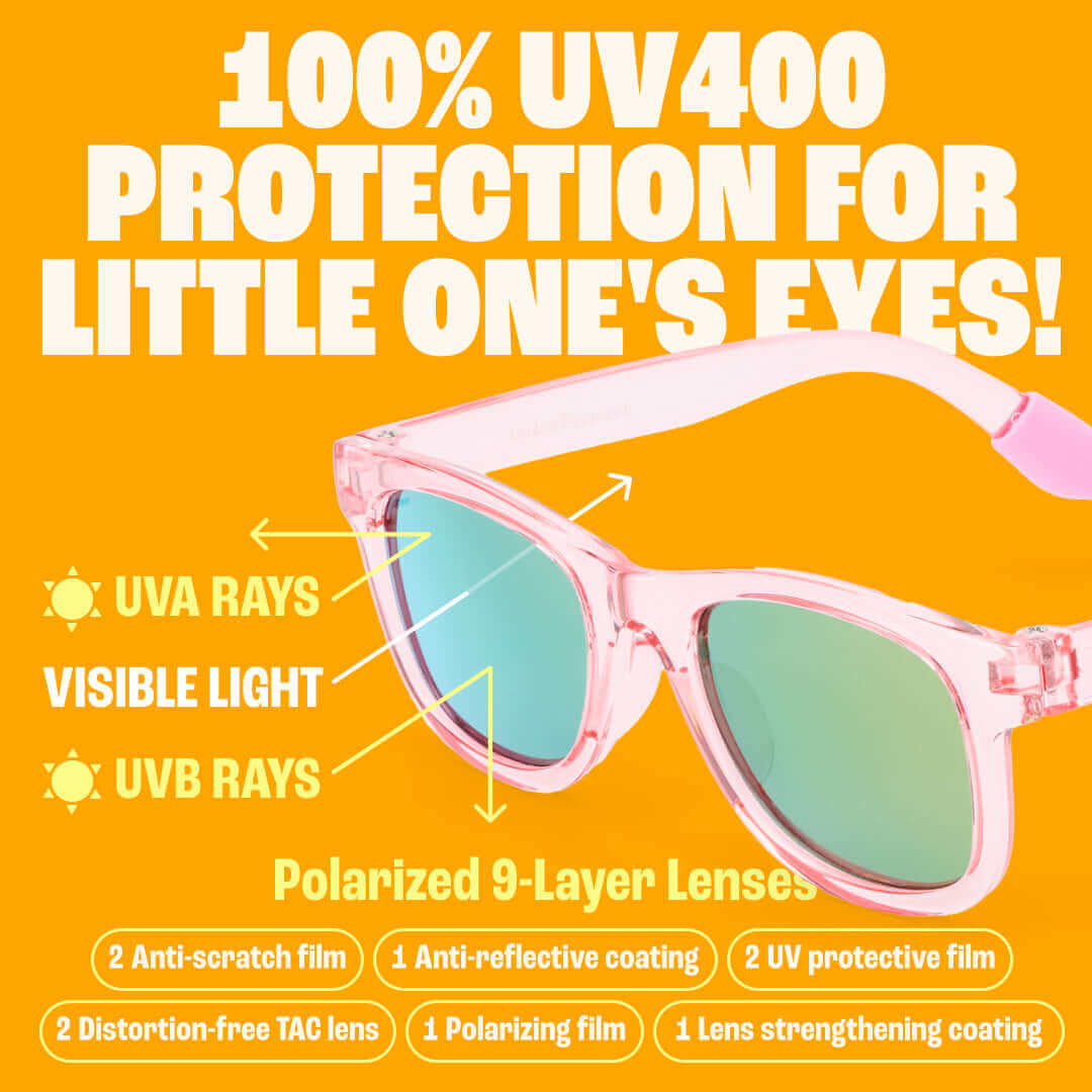 Hold dit barns øjne sikre på alle eventyr - UV400 polariserede linser blokerer 100% af UVA- og UVB-stråler for at mindske blænding og beskytte sarte øjne